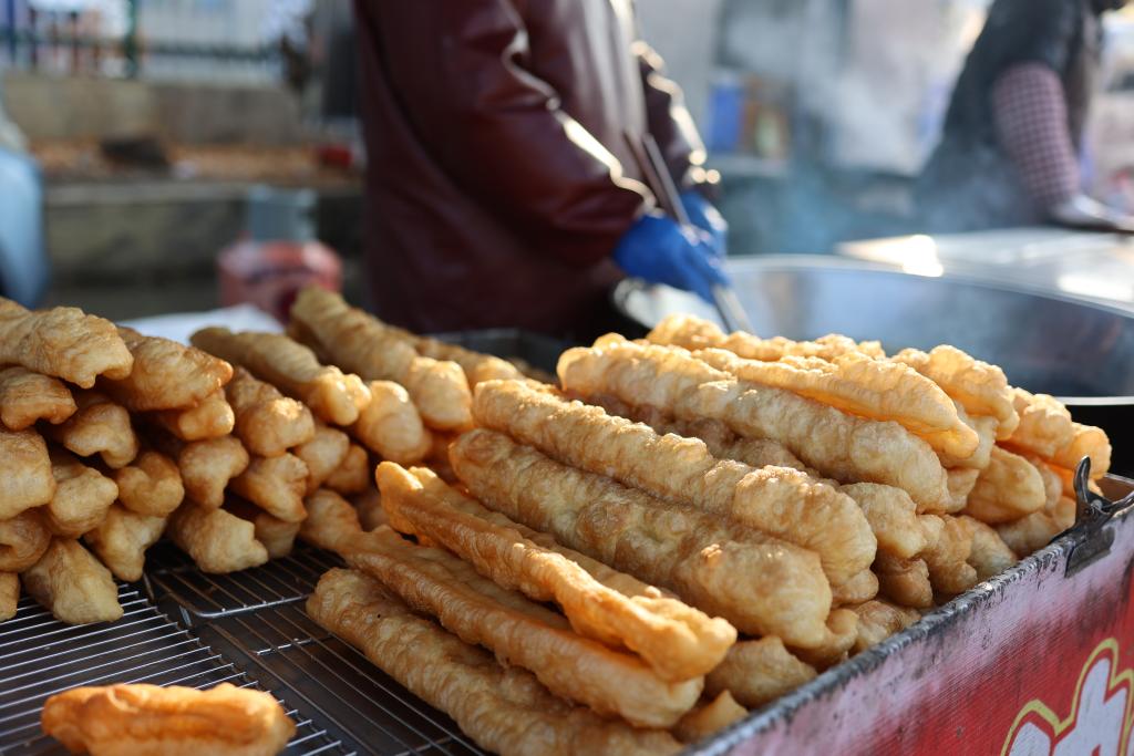 这是侯家大集上刚出锅的油条。新华社发(刘苏洋 摄)