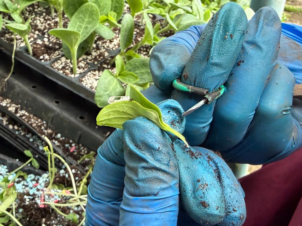 今年40岁的嫁接工王芳用刀片在瓜苗上迅速斜切一刀,随即换持另一棵瓜苗,在顶端中心位置垂直劈开,再将两棵瓜苗嵌合。整个过程用时不到10秒。