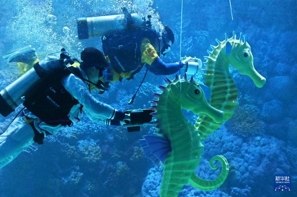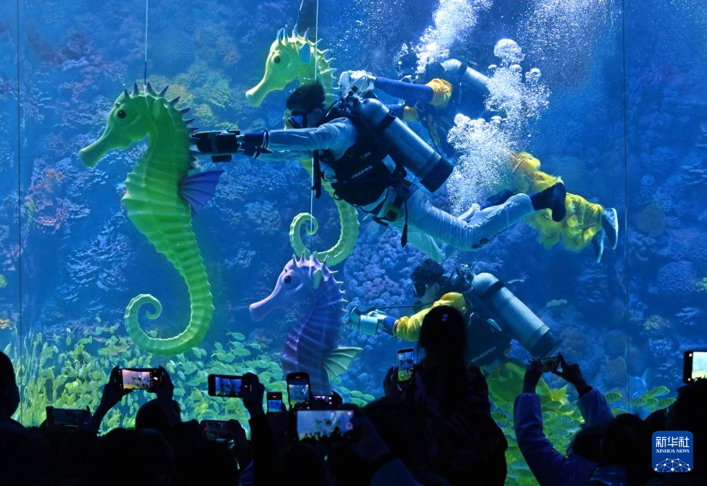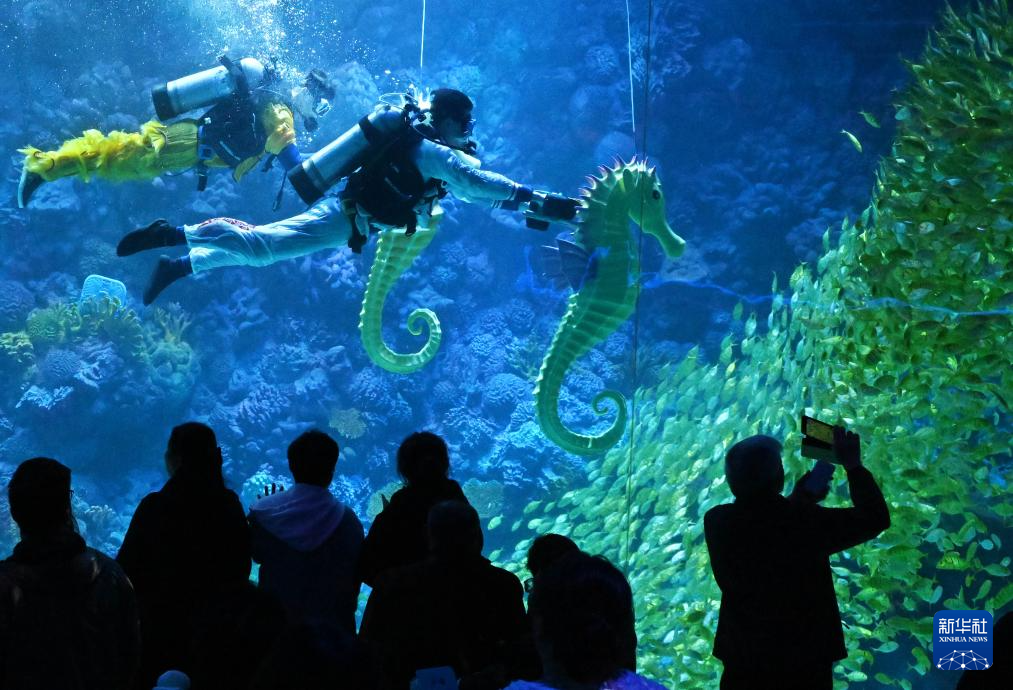 春节假期,青岛极地海洋公园推出水下“赛马”贺新春演艺项目,将传统年俗与海洋特色文化相结合。潜水员操控海马道具在水中相互追逐,欢快趣味的表演令游客耳目一新。