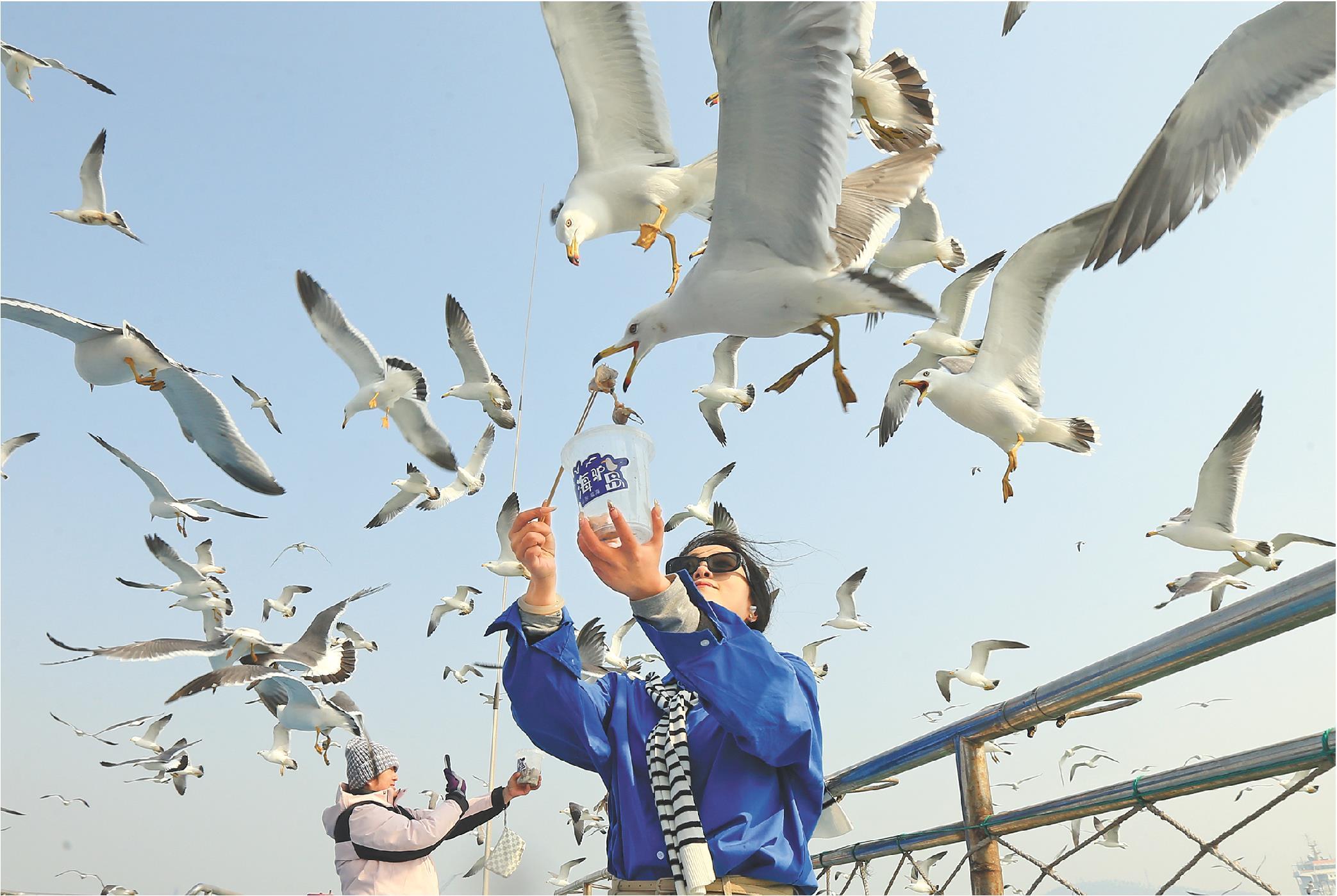 3月15日,山东省荣成市西霞口海驴岛景区,环岛观鸥游项目开航,游客乘船环岛观赏黑尾鸥翱翔,感受海风拂面,体验人与自然和谐共生。