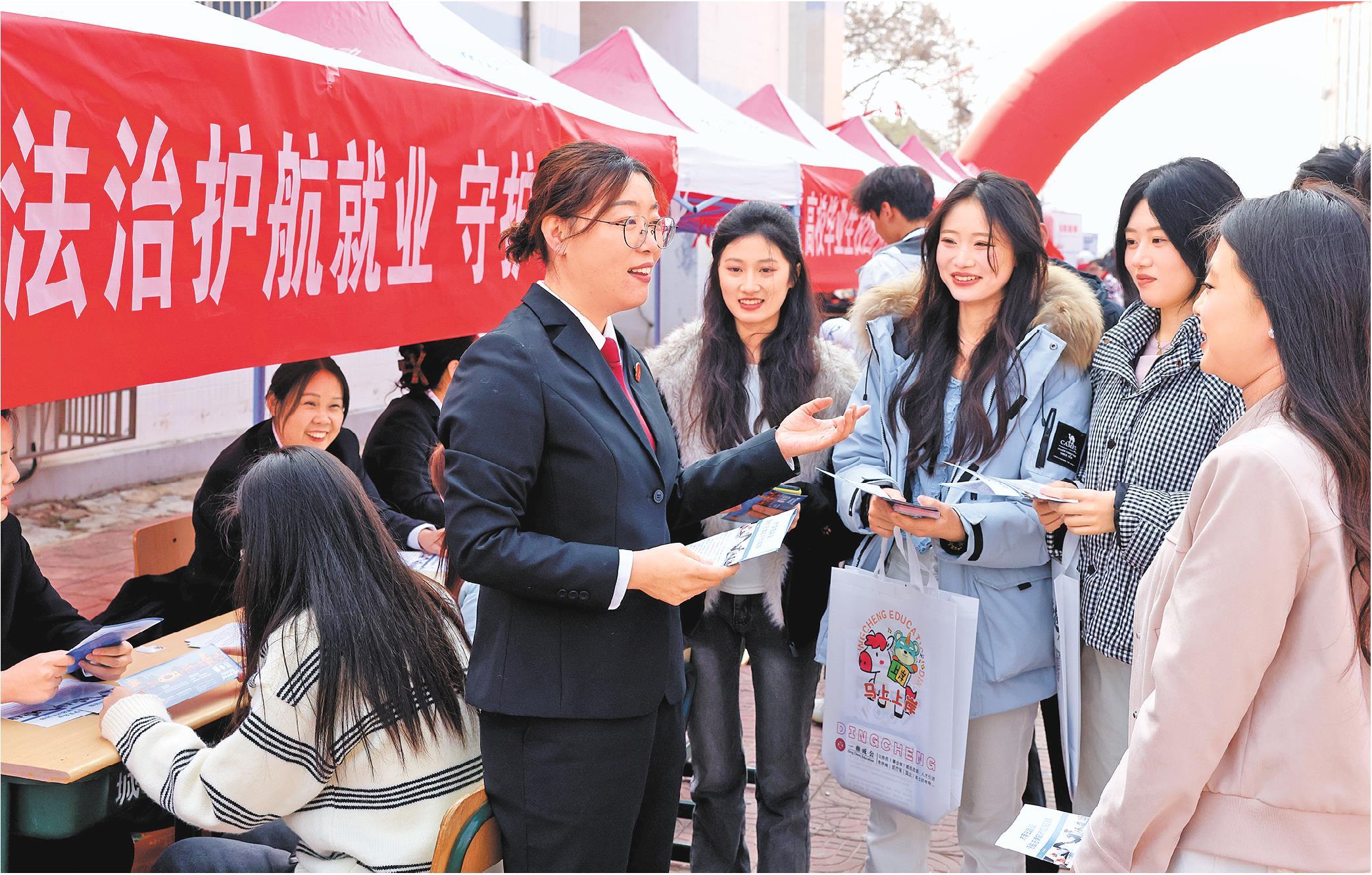 同时,山东省枣庄市人社局、法院、工会等单位工作人员现场为求职大学生提供就业指导服务,助力高校毕业生就业。图为枣庄市市中区人民法院法官向求职大学生宣讲劳动用工相关法律法规。