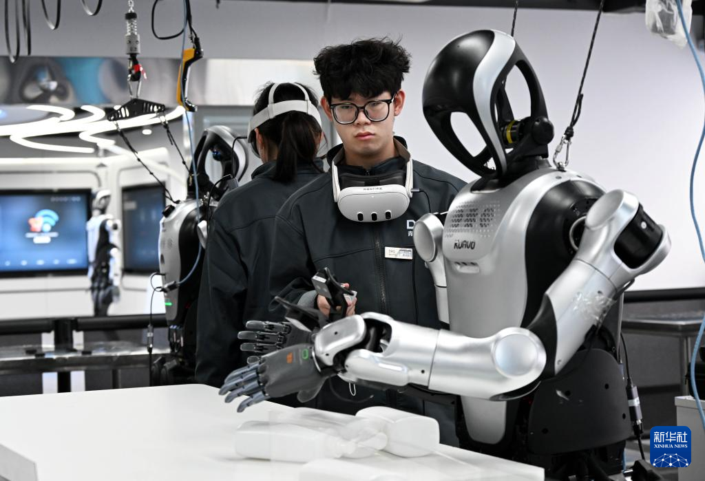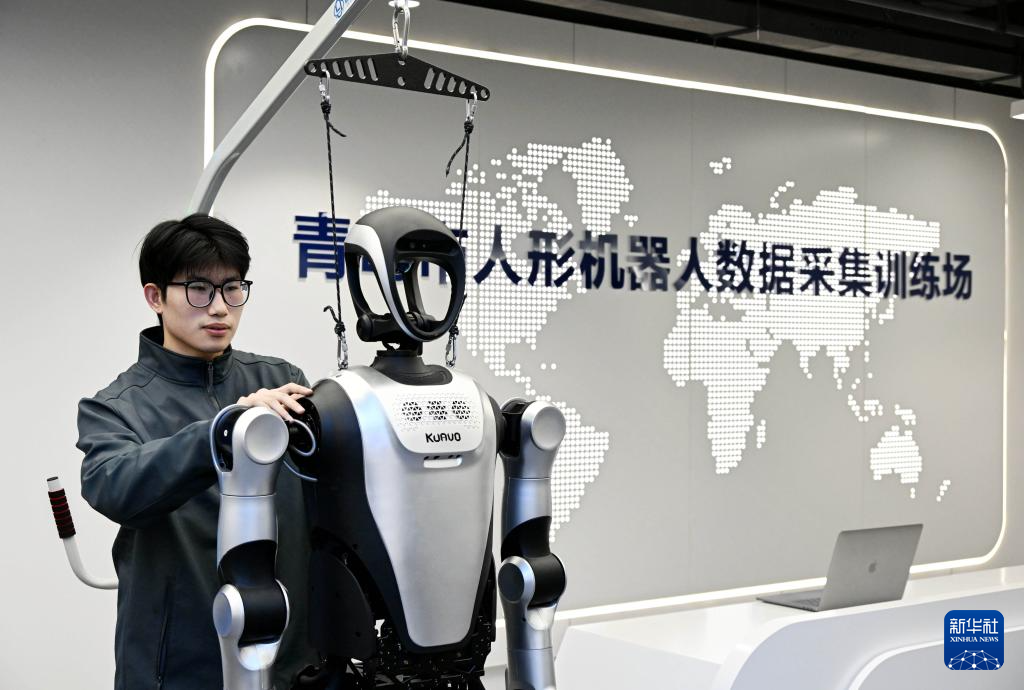 3月23日,在青岛市人形机器人数据采集训练场,工作人员对人形机器人进行训练和数据采集。新华社记者 李紫恒 摄