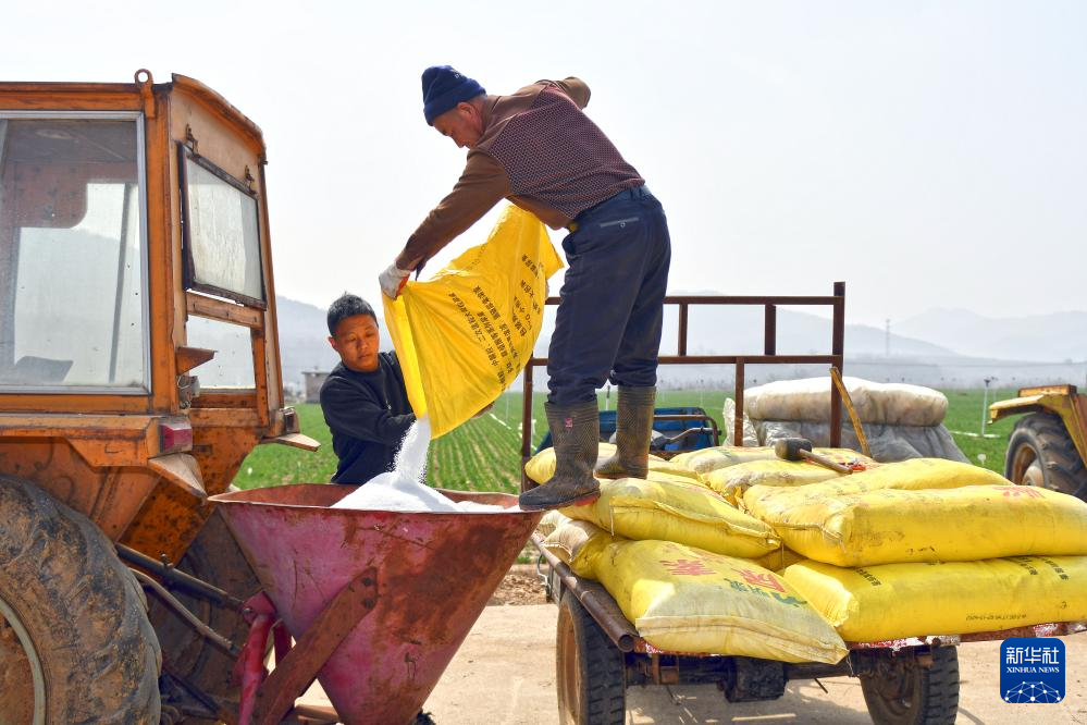 3月23日,在山东省烟台市福山区高疃镇,农民准备为小麦施肥。新华社发(孙文潭摄)