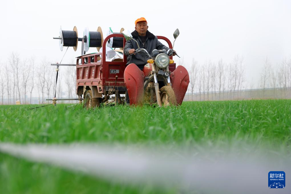 3月23日,在山东省聊城市茌平区冯官屯镇,农民给小麦铺设滴灌带。新华社发(马红坤摄)