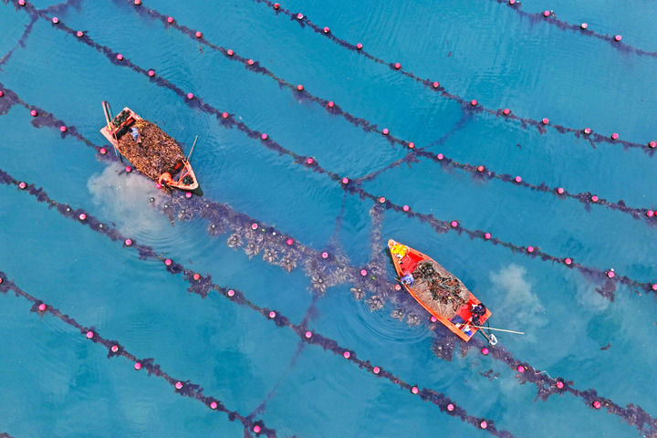 山东省荣成市爱伦湾海洋牧场正忙着“海上春耕”。新华社发(王福东摄)