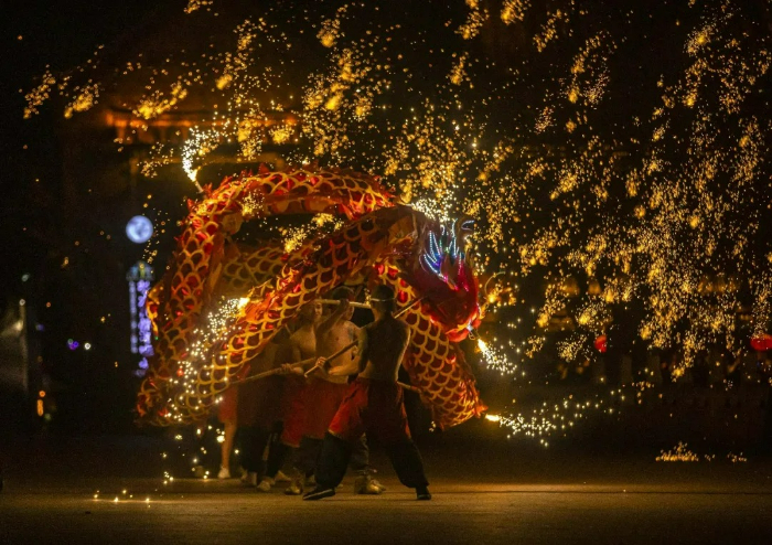 将1600℃的铁水泼向空中,炸裂成漫天金色星辰,如同火树银花不夜天。“打铁花”在台儿庄的夜空中绽放出最震撼的东方浪漫。