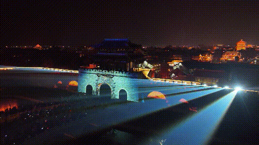 光影秀在城墙上铺开,以光影为笔,城墙为卷,重现历史场景,看运河水乡的繁华仿佛破墙而出,感受一场沉浸式的光影叙事。