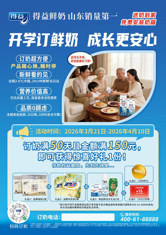 为进一步满足广大消费者需求,得益乳业推出“开学订鲜奶,成长更安心!”双月订奶活动:即日起至4月10日,订奶满50天、订单金额≥150元即可自选好礼,多重福利叠加、权益灵活畅享,通过更优的产品组合、更实的惠民政策以及更严的服务标准,让每一位消费者都能享受到从牧场到餐桌的全程鲜活保障。