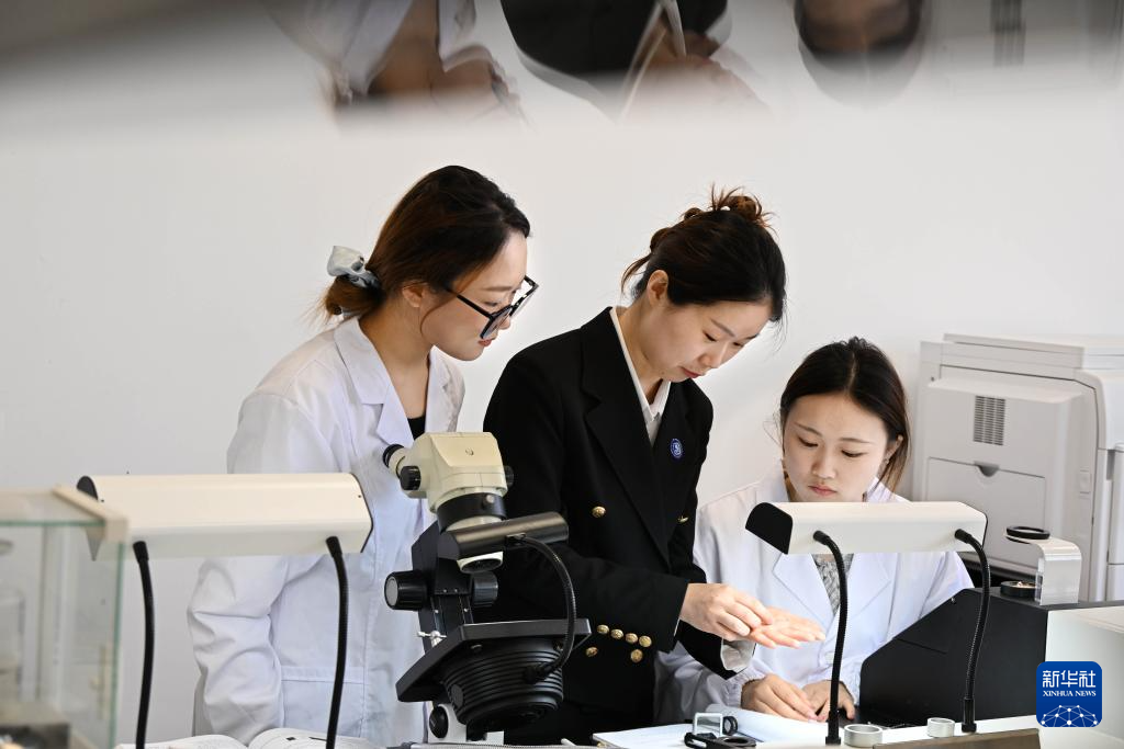 在青岛幼儿师范高等专科学校宝玉石质监站,教师(中)指导学生为企业产品进行检测(3月31日摄)。