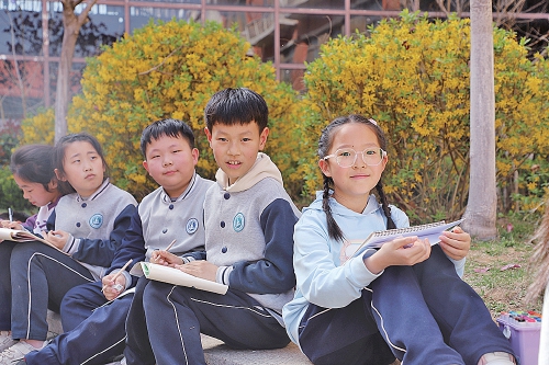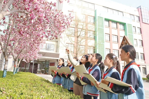 山东师范大学长清湖实验学校学生在繁花中学习、绘画。