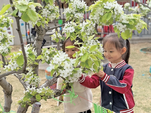 济南市天桥区兴麓幼儿园的孩子们在观察梨花。