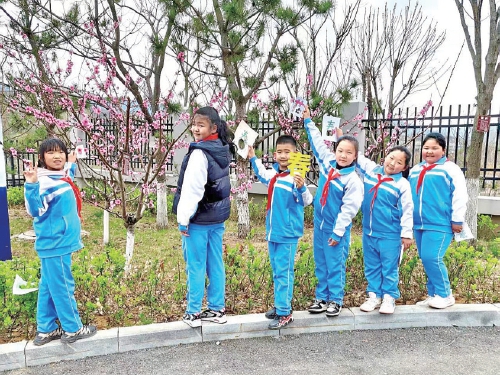 济南市南部山区西营街道中心小学学生在花树旁展示美术作品。
