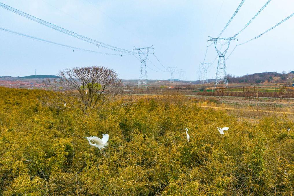 新华社济南4月1日电(记者贾云鹏)4月1日国际爱鸟日来临之际,山东省日照市岚山区黄墩镇浔河岸边,高大的杨树间,陆续归来的白鹭正衔枝筑巢。百米之外,国网山东省电力公司烟威1000千伏特高压线路工程的施工现场,最后一段导地线展放完毕。当白鹭结队掠过杆塔上空,这片工地已恢复宁静,只留下崭新的铁塔静静矗立,与鸟影相映成趣。