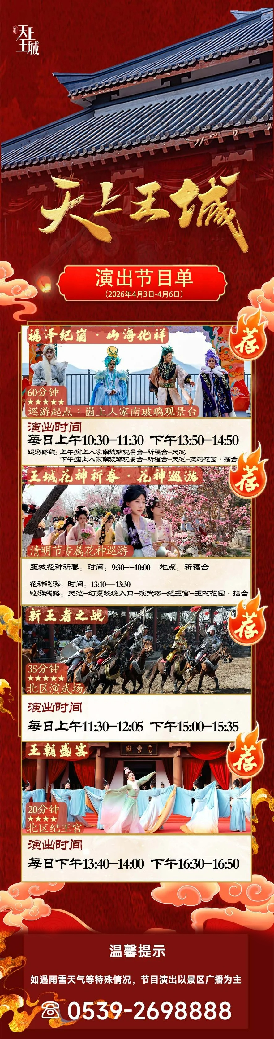 《新王者之战》、《王朝盛宴》、《山海化祥·福泽纪崮》NPC巡游、《比武招亲》……一天近百场演出,好戏连台,给您不一样的春日盛宴。
