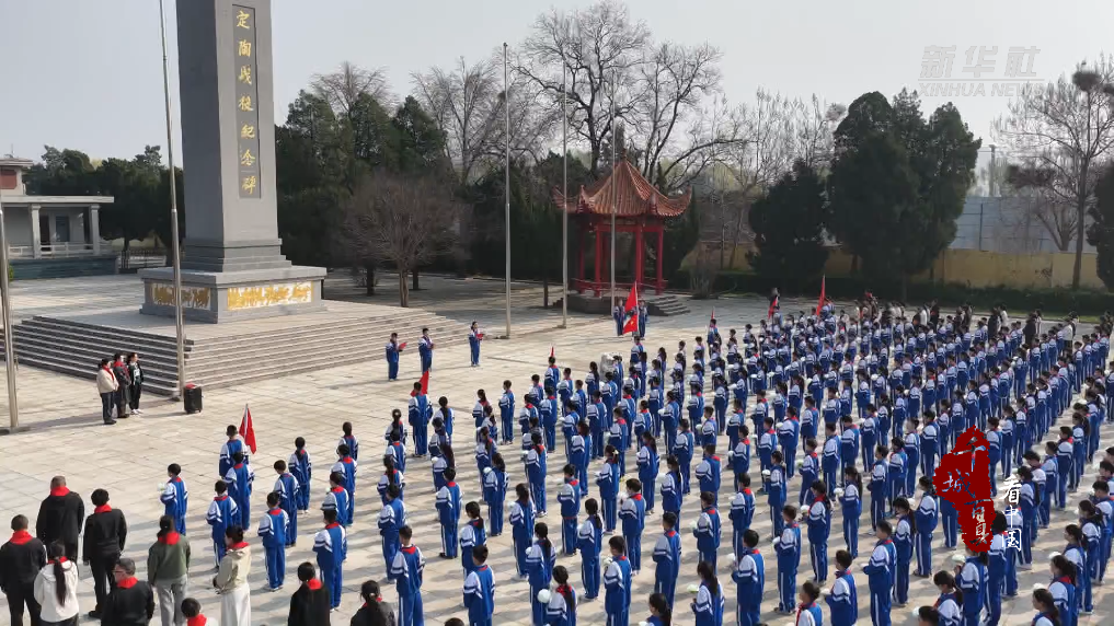 菏泽市定陶区各学校少先队员敬献素花、为碑文描金,在纪念碑前聆听历史事迹,重温峥嵘岁月。