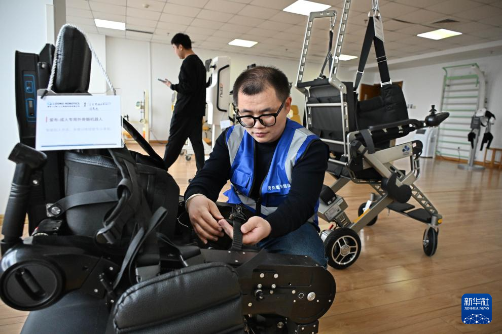 4月9日,在青岛市康养领域具身机器人暨智能康复类产品训练验证中心,工作人员准备对一台成人专用外骨骼机器人进行测试。新华社记者 李紫恒 摄