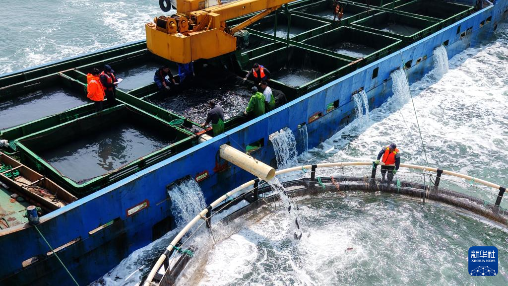 4月10日,山东青岛西海岸新区鲁海丰海洋牧场2026年首批10万尾鱼苗投入深水网箱进行养殖。据悉,青岛鲁海丰海洋牧场地处国家一类水质海域,水温适宜、盐度均衡,比较适宜海鱼生长。新华社发(俞方平摄)