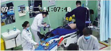 一分钟后,10点59分,王大鹏带着急诊的实习护士曹梓彤推着平车跑回店里。此时,男子的情况已经恶化:脸色发紫,嘴里吐出血沫,眼睛上翻,没有了呼吸。