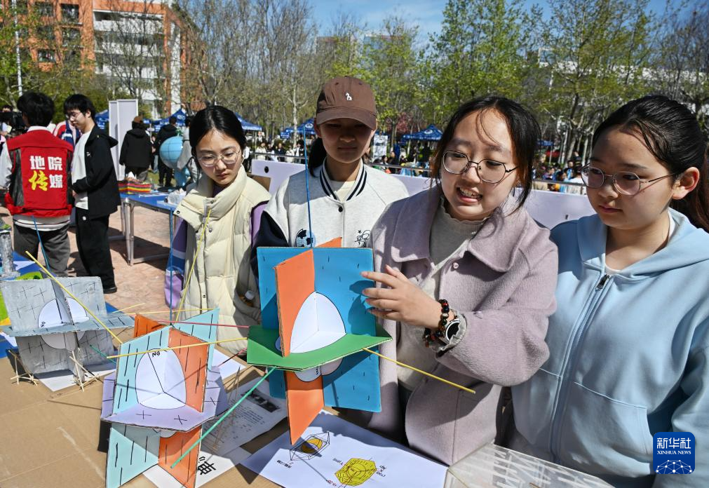 4月19日,参赛者在地质模型制作大赛上介绍晶体结构模型。新华社记者 李紫恒 摄