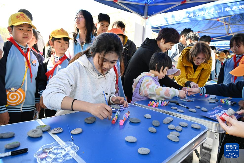 4月19日,游园参与者在地球科学文化游园会上绘制石头画。新华社记者 李紫恒 摄