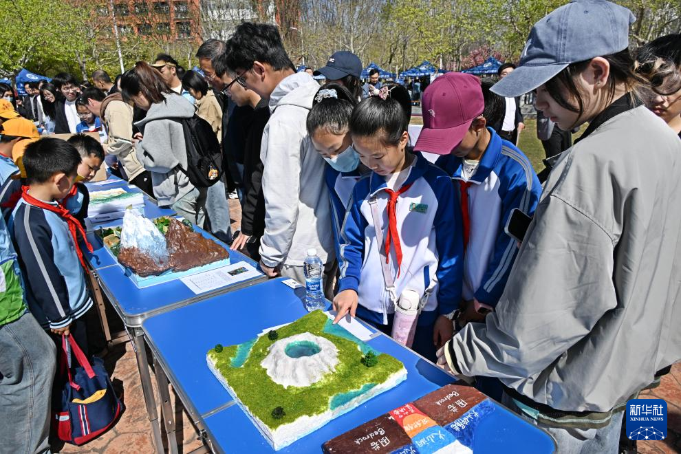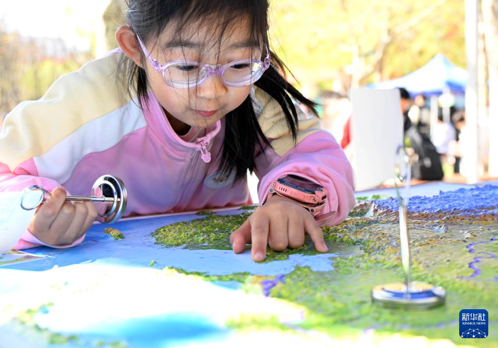 4月19日,一名小女孩在地球科学文化游园会上识别地貌。新华社记者 李紫恒 摄
