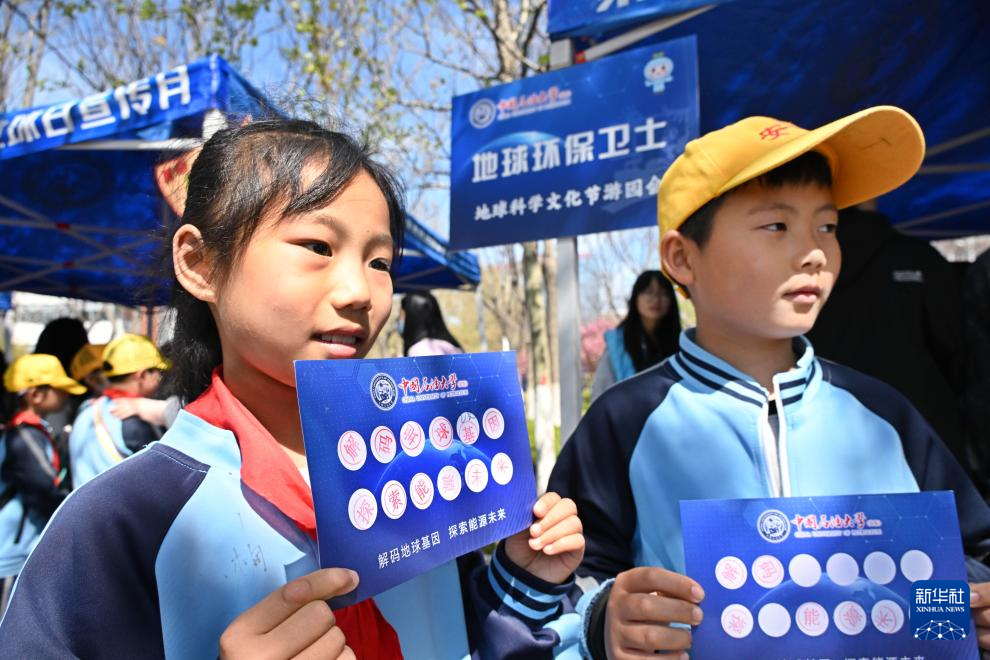 4月19日,小学生在地球科学文化游园会上展示打卡徽章。新华社记者 李紫恒 摄