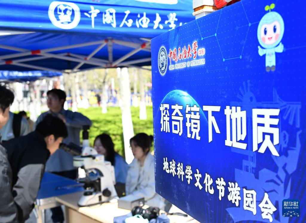 4月19日,游园参与者在地球科学文化游园会上通过显微镜观看地质样本。新华社记者 李紫恒 摄