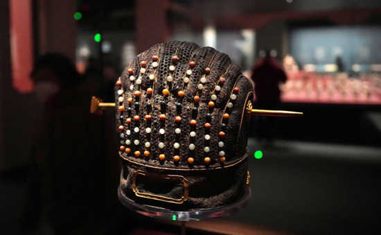 “鲁王之宝——明朱檀墓珍藏”展览上展出的明朱檀墓出土九缝皮弁。新华社记者徐速绘 摄