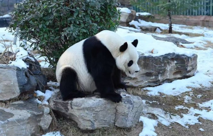 济南:大熊猫雅吉踏雪嬉戏引游人驻足