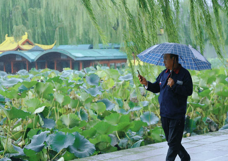秋雨霏霏,济南大明湖秋荷引游人驻足